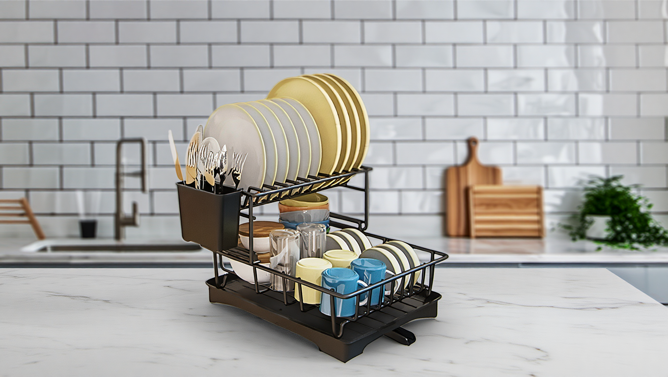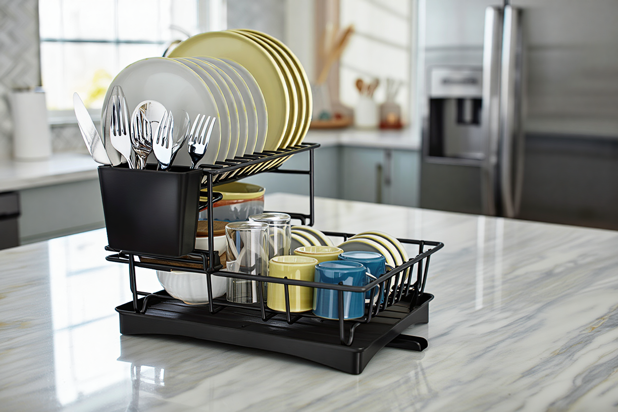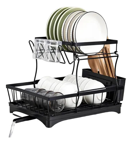 Optimiza tu espacio en la cocina y mantén tu mesada seca con este elegante y funcional escurridor de platos de metal. Su diseño inteligente te permite secar tus utensilios de forma higiénica y eficiente, mientras su bandeja integrada se encarga de todo el goteo. 💧