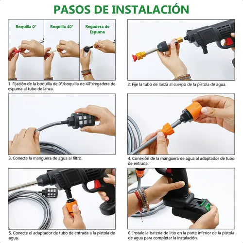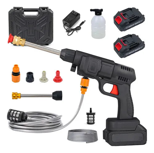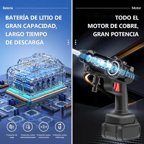 - ⚡ Potencia Inalámbrica de 48V: Equipada con una batería de litio de alto rendimiento (48V), esta hidrolavadora ofrece la presión y el caudal de agua necesarios para remover la suciedad más incrustada, sin depender de enchufes.