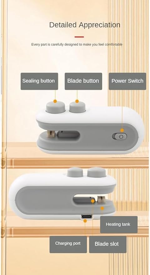 - Función 2 en 1: Combina un sellador térmico y un cortador en un solo diseño compacto. La cuchilla incorporada te permite abrir bolsas fácilmente, y la banda térmica las sella de forma segura.