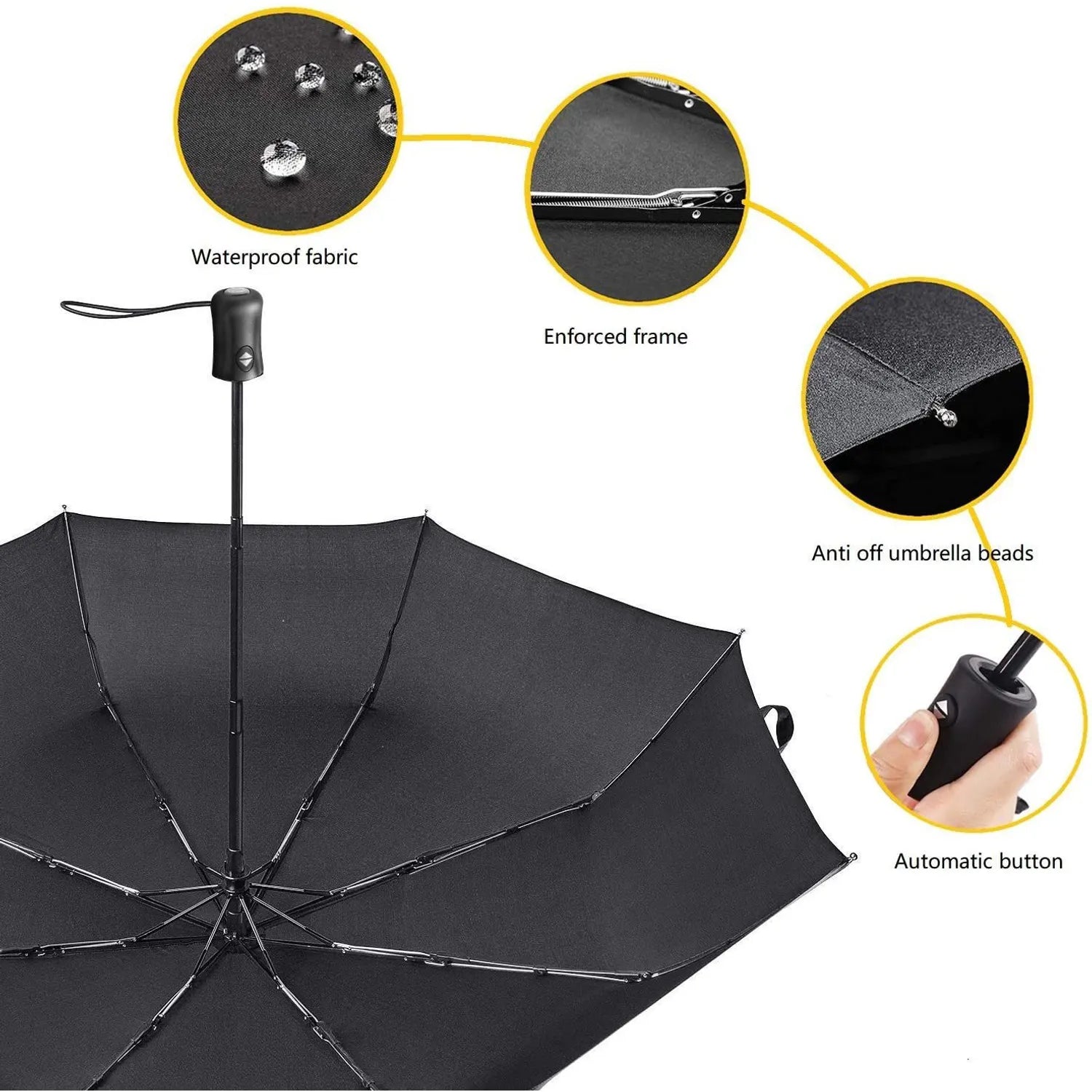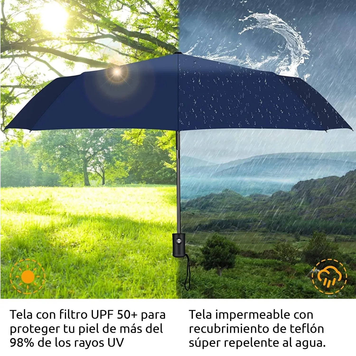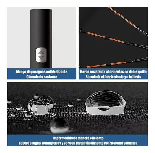 Apertura y Cierre Automáticos: Con solo un botón, la sombrilla se despliega y se pliega para una protección instantánea y sin esfuerzo. Es ideal para esos momentos en los que necesitas reaccionar rápidamente a un cambio de clima.